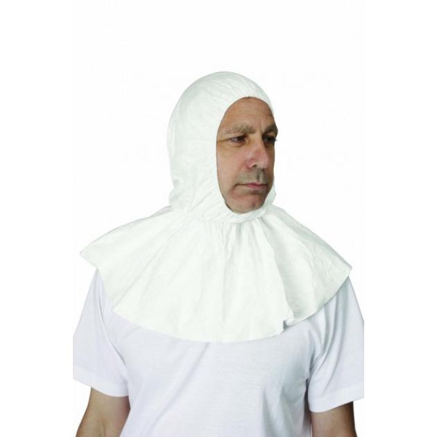 Kaklo apsauginis gaubtas pagamintas iš TYVEK, medžiaga: neaustinis polietilenas, antistatinis, be silikono, apsaugantis nuo vandens, cheminių tirpalų, asbesto ir dulkių. Universalus dydis.