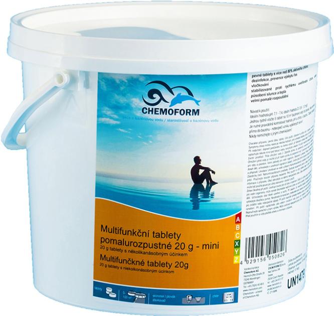 CHEMOFORM daugiafunkcinės tabletės MINI 20g su daugialypiu poveikiu, skirtos patogiai baseino vandens priežiūrai.