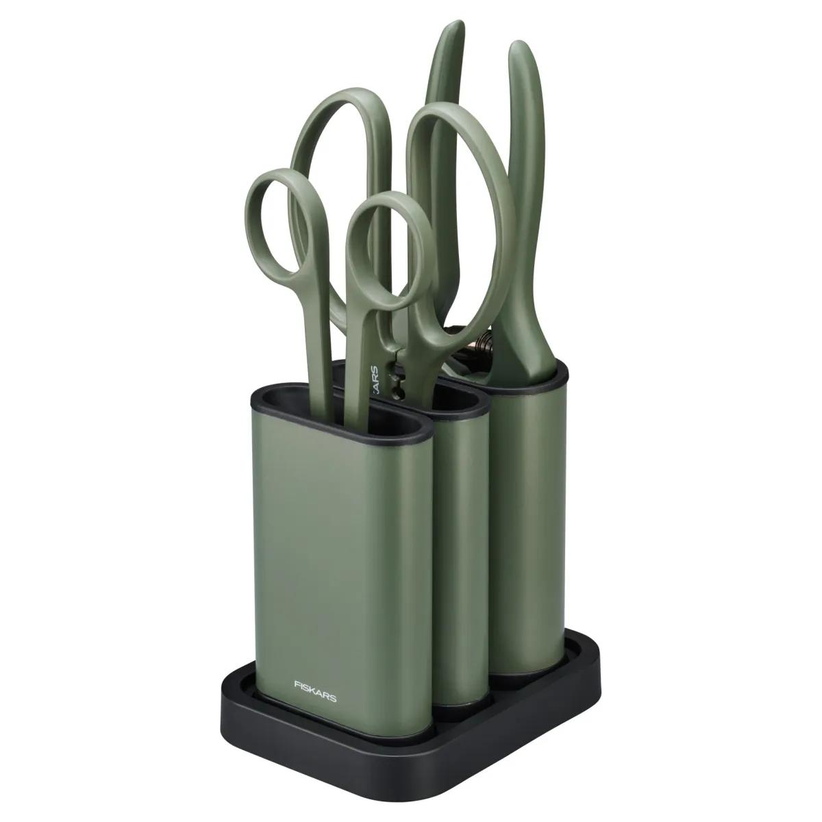 Paverskite savo terasą, balkoną ar namus žalia oaze su „Fiskars Plant“ žirklių rinkiniu. Rinkinyje yra plonos, elegantiškos formos genėjimo žirklės, skirtos tiksliam genėjimui, žirkles su dideliais akimis rankenose, idealias lapų ir spyglių pašalinimui nuo gėlių stiebų, bei sodo žirkles su tvirtomis rankenomis, skirtas sunkiausiems stiebų, šakų ir šaknų pjovimo darbams iki 1 cm storio. Prie visų žirklių pridedami laisvai stovintys dėklai. Visos žirklės turi grūdinto plieno ašmenis, tiksliai išgaląstus, kad pjūviai būtų švarūs ir sveiki. Formuotos rankenos puikiai laikosi rankoje. Laisvai stovinčius dėklus su žirklėmis galima pastatyti atskirai ant darbo stalviršio arba įdėti į bendrą pagrindą ir taip stilingai laikyti įrankius.