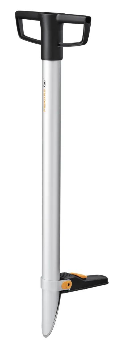 Fiskars Xact svogūnėlių sodinimo įrankis leidžia sodinti svogūnėlius ir mažų medelių sodinukus nesulenkiant nugaros ir neklūpint. Iškasite duobutę, įdėkite į ją svogūnėlį ir užberkite žemėmis – visa tai atliksite per kelis paprastus žingsnius. Tvirtas ir lengvas aliuminio kotas baigiasi peiliu ir turi pėdos pedalą, skirtą lengvai iškasti duobę. Fiksavimo mechanizmas ant pėdos pedalo užfiksuoja peilį atvirą ir leidžia į sodinimo įrankį įdėtam svogūnėliui nukristi tiksliai į iškastą duobę. Ištraukite sodinimo įrankį iš žemės, užberkite svogūnėlį žemėmis ir šiek tiek jas sutankinkite. Skirtas svogūnėlių ir mažų medelių, kurių skersmuo neviršija 50 mm, sodinimui. Sodinimo gylis iki 150 mm