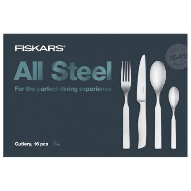 Fiskars stalo įrankiai gaminami iš aukštos kokybės nerūdijančio plieno Suomijos gamykloje. 16 dalių modernaus dizaino šakutės, peilių, šaukštų ir šaukštelių rinkinys skirtas 4 asmenims.